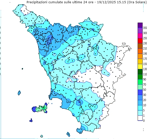 La mappa dei cumulati nelle ultime 24 ore mostra come l’evento abbia interessato buona parte della Toscana occidentale, con fasce comprese fra 50 e oltre 100 mm, in particolare tra l’alta costa livornese, le aree apuane e i crinali appenninici.